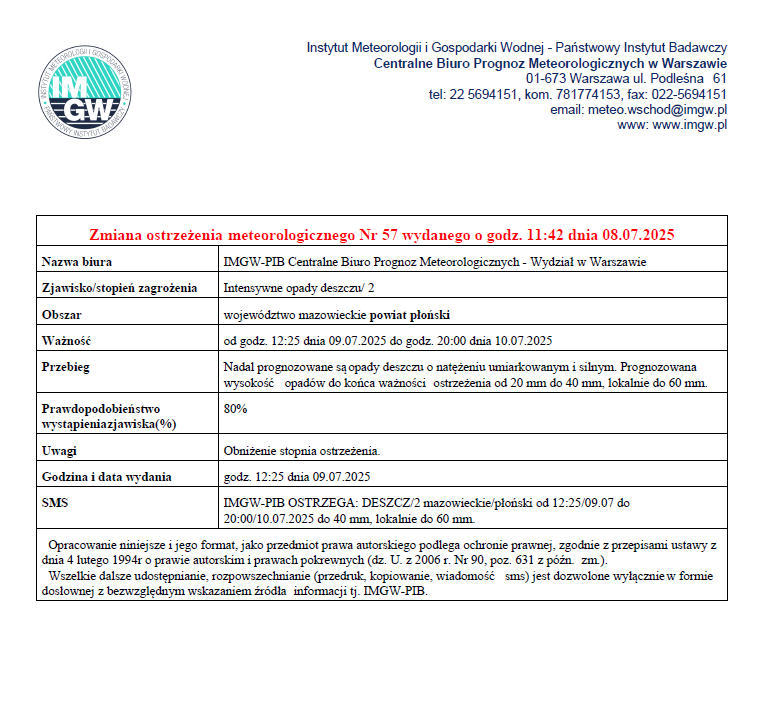 Zmiana ostrzeżenia meteorologicznego Nr 57