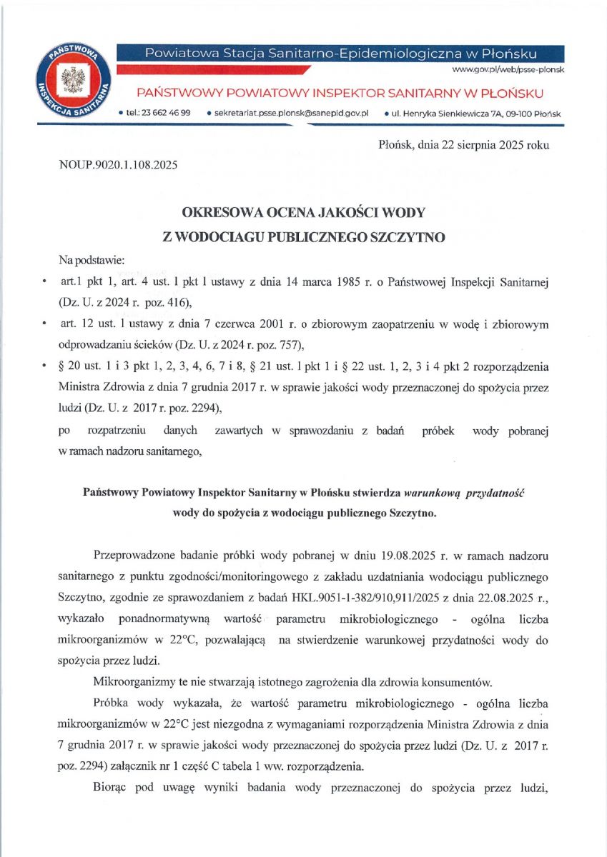 Państwowy Powiatowy Inspektor Sanitarny w Płońsku informuje, że w badaniach jakości wody