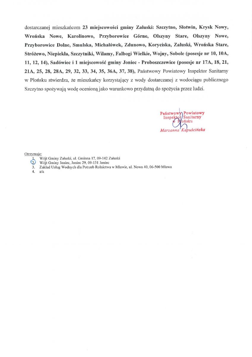 Komunikat dotyczy mieszkańców miejscowości Proboszczewice (posesje nr 17A, 18, 21, 21A, 25, 28, 28A, 29, 32, 33, 34, 35, 36A, 37, 38) korzystających z wodociągu publicznego w Szczytnie.