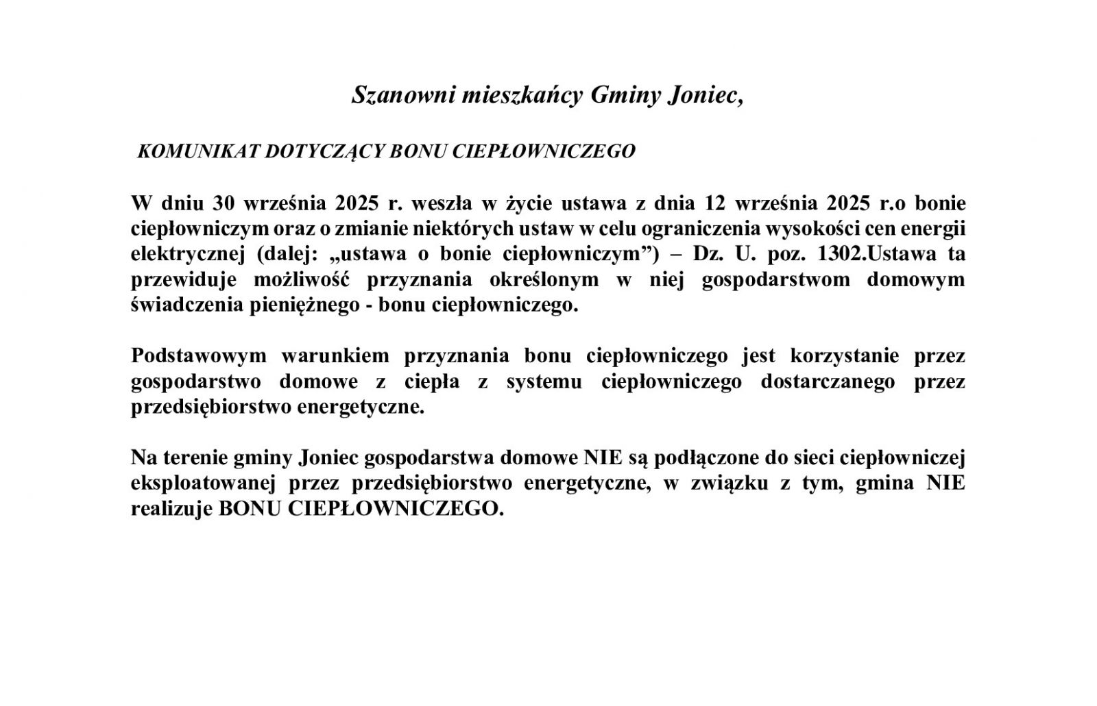 KOMUNIKAT DOTYCZĄCY BONU CIEPŁOWNICZEGO