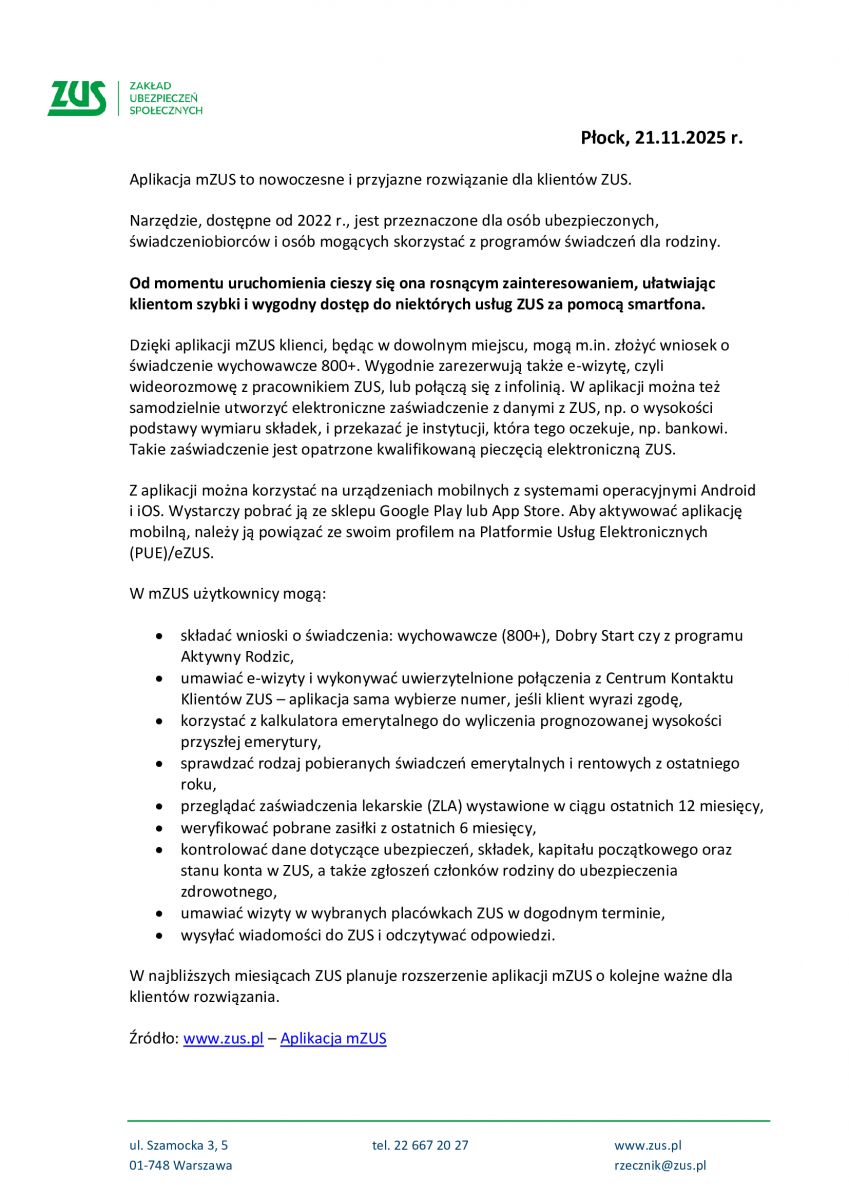 Informacja prasowa - aplikacja mZUS