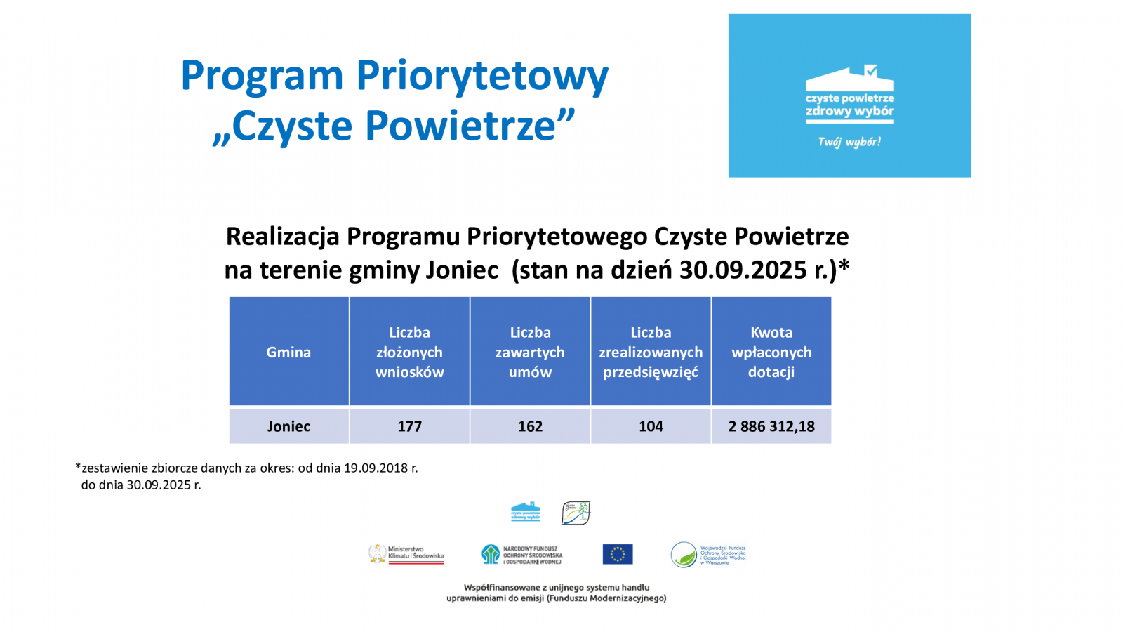 Realizacja Programu Priorytetowego Czyste Powietrze na terenie gminy Joniec (stan na dzień 30.09.2025 r.)